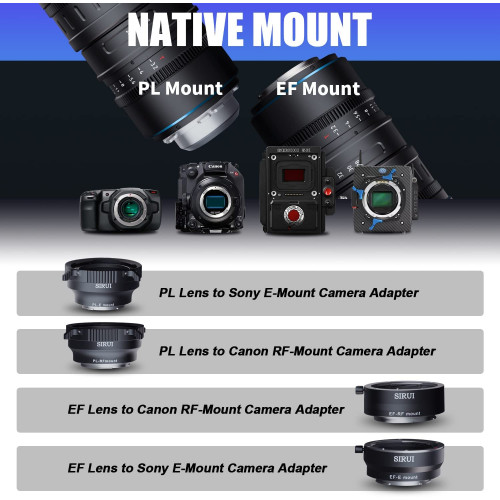 Las lentes de la serie SIRUI Jupiter están diseñadas con monturas nativas EF/PL, especialmente creadas para cineastas profesionales con cámaras de montura PL/EF y compatibles con modelos de montura PL/EF como ALEXA Mini LF, ALEXA Mini , ALEXA LF,(montura PL) así como BMPCC-6k, BMPCC-6k-pro, EOS C300 Mark III, EOS C500 Mark II (montura EF), etc.