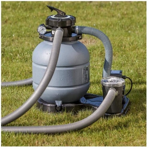 - Contenido del envío: pasamanos de acero, pared de acero de 0,45 mm, lámina de 0,3 mm gris, skimmer con boquilla de entrada, manguera de 38 mm, escalera de tubo de acero y filtro de arena de 4 m³/h, incluye arena de cuarzo