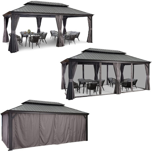 El establo impermeable cenador preparado para el invierno con paneles laterales Doble techo para una óptima ventilación y comodidad, ayuda a soportar fuertes vientos El techo de la glorieta está hecho de aluminio y metal en lugar de tela ordinaria o policarbonato. Las cortinas y redes removibles protegen su privacidad al aire libre Este cenador de techo rígido de jardín de metal se puede utilizar como una carpa de fiesta de cenador de jardín, barbacoa de cenador plegable, cochera, refugio al aire libre y cenador de patio Este cenador con techo fijo seguro que impresionará a tus invitados.