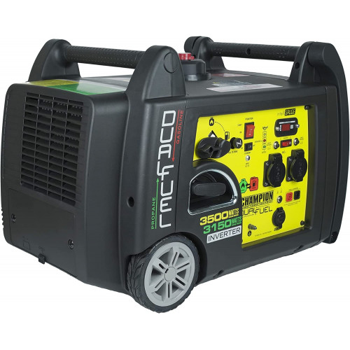 • El generador CHAMPION Dual Fuel Inverter cuenta con un potente motor de 4 tiempos OHV de 192cc que produce un máximo de 3500W con gasolina y 3150W con propano. Con un depósito de 6 litros, este generador híbrido puede funcionar hasta 8 horas con gasolina y 11 horas con propano con una bombona de 13 kg (consumo 840 g/h). Este silencioso generador es ideal para acampar, cazar, viajar, hacer picnics y trabajos ligeros en casa. El asa integrada y el kit de ruedas facilitan su transporte. El mayor atractivo de este generador es su funcionamiento híbrido. Esto se debe a que el gas le ofrece un coste de funcionamiento más bajo que el combustible. Las emisiones de gas le permiten utilizarlo en situaciones en las que la gasolina no es apropiada, por ejemplo, cerca de alimentos o en sitios en los que la gasolina no está permitida. El uso del gas también le ofrece unos costes de mantenimiento reducidos en comparación con la gasolina. Características: - Monofásico. - Motor OHV 4T - 192 cm³. - Arranque eléctrico mediante pulsador y arranque manual. - Autonomía: 8 horas con gasolina y 11 horas con propano. - Potencia en gasolina: 3500 W máx. en el arranque, 3200 W de funcionamiento. - Potencia de gas: 3150 W máx. en el arranque, 2880 W de funcionamiento. - Potencia 3,5 KVA máx. - 2 tomas de corriente de 230V AC - 16 A. - 1 toma de corriente de 12V DC. - Salida de CC: 12/8,3. - Adaptador USB de doble puerto (2,1A/1A) (incluido). - Nivel de potencia sonora: 58 dB(A) a 7 m. - Capacidad del depósito de combustible: 6 L. - Capacidad del depósito de aceite: 0,6 L. - Sensor de parada por falta de aceite. - Protección contra sobrecarga del regulador. - Voltímetro inteligente 3en1. - Asa y rueda integradas para facilitar el transporte. - Regulador de propano de 37mBar incluido. - Conectable en paralelo: para acumular potencia (con otro generador). - 2 ruedas para facilitar el transporte. - Dimensiones: 63,7 x 44 x 46,1 cm. - Peso: 43,4 kg. - Certificación: CE, Fase V de la UE, compat