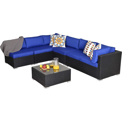 SUNVIVI Outdoor - Juego de muebles de jardín de 7 piezas, para todo tipo de clima, juego de muebles de mimbre sintético para patio con mesa de cristal, cojines extraíbles
