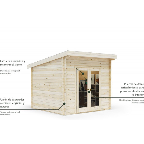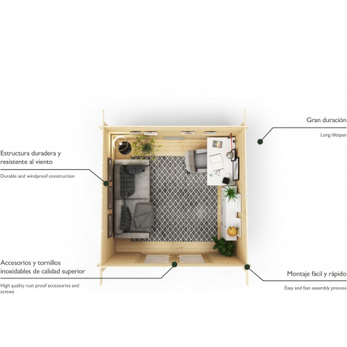 - Oficina en el Jardín: Con sus dimensiones de 3x3m y excelente aislamiento, este pequeño refugio de jardín es ideal para convertir tu oficina en casa en un espacio de trabajo excepcional en tu propio jardín.