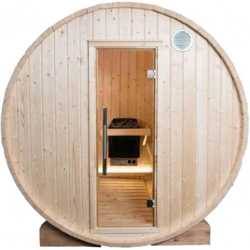 Características Técnicas Avanzadas: Con una longitud exterior de 220 cm, un diámetro de 220 cm, y una capacidad para cuatro personas, esta sauna ofrece suficiente espacio para un uso cómodo. Está equipado con dos banquetas de madera, dos respaldos, y un piso horizontal, lo que garantiza comodidad y estabilidad.