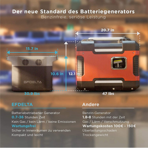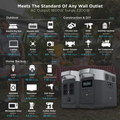 • 4 enchufes de CA de 1800 W y 1260 Wh de capacidad】 Equipado con una gran carga de inversor que puede alimentar la mayoría de los electrodomésticos y herramientas de bricolaje más fuertes con menos de 1800 W (3300 W pico sinusoidal) como televisor, frigorífico, cafetera, microondas, taladro o sierras. Con una capacidad de 1260 Wh, EFDELTA es capaz de ser un verdadero generador de emergencia que puede alimentar la iluminación y los frigoríficos durante horas.