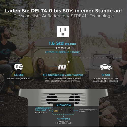 • 【Carga de 0% a 80% en 1 hora】 La estación de carga Delta 2 se puede cargar en 1 hora de 0% a 80% y en 2 horas al 100%. Tecnología X-Stream: con la tecnología X-Stream patentada por ECOFLOW, la estación de alimentación 2 DELTA se puede cargar con un solo cable de CA estándar con 10 veces la velocidad en comparación con la mayoría de otros SAI portátiles disponibles en el mercado sin afectar al peso del producto.
