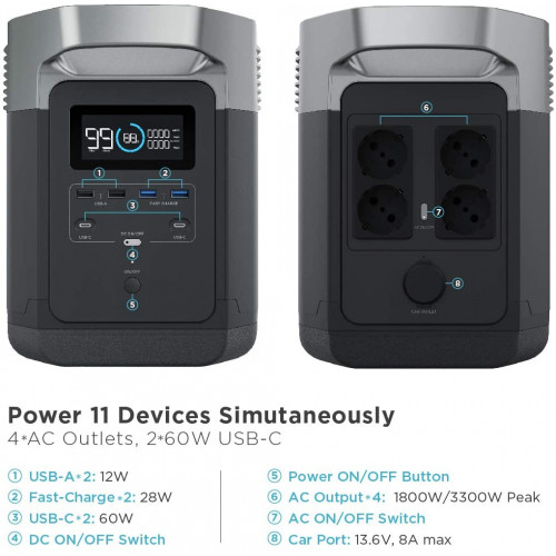 • Funcionamiento simultáneo de hasta 13 dispositivos: EFDELTA se adapta a cualquier puerto que necesites para alimentar tus dispositivos en cualquier lugar para que siempre te sientas como en casa. Por ejemplo, EFDELTA puede alimentar los siguientes 11 dispositivos al mismo tiempo: 4 enchufes de corriente continua: nevera, televisor, luz, sartén eléctrica, batidora y café; 2 x 60 W USB-C: MacBook Pro y Nintendo Switch; 4 x USB-A (2 normales + 2 carga rápida): smartphones, altavoces y tabletas