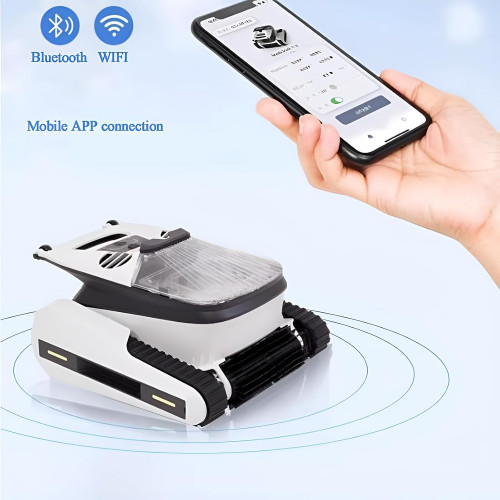 El robot aspirador de piscinas adopta un diseño inalámbrico, sencillo y fácil de usar, que elimina eficazmente los residuos o la basura de la piscina, como hojas caídas, polvo, grava, pelos y algas. Su batería de litio integrada de gran capacidad de 10400 mAh y dos potentes motores/bombas de succión permiten cubrir una piscina de hasta 200 m², incluyendo la limpieza completa del fondo, las paredes y el nivel del agua. El robot se acopla automáticamente al borde de la piscina para facilitar su recuperación al finalizar la limpieza o cuando la batería está baja.