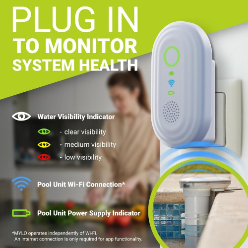 - Conectividad sin costuras: nuestro monitor inteligente de piscina funciona de forma independiente de Wi-Fi, se conecta sin esfuerzo a una unidad doméstica para un monitoreo constante sin la necesidad de configuración adicional. *WI-FI es necesario para la aplicación.