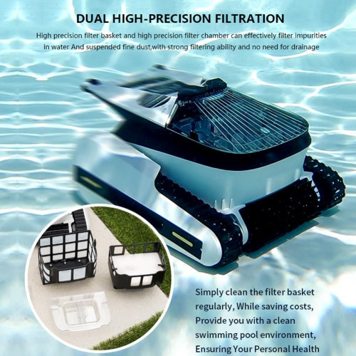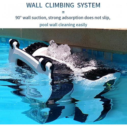 - Ascenso automático de pared de 90°: Con una potente succión y un cepillo de alta velocidad que trabajan en conjunto para proporcionar una limpieza profunda, también se pueden cepillar los espacios entre las baldosas para eliminar fácilmente la suciedad del fondo de la piscina. El cepillo de esponja suave multicapa de densidad PET y el proceso de afilado facilitan la limpieza de los espacios.