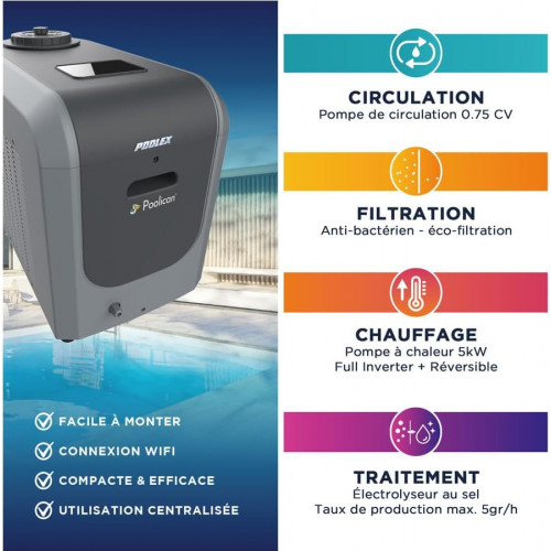 Bomba de calor centralizada y conectada Poolican Poolex para piscina 25m3. Los 4 indispensables para su piscina en una sola solución. Bomba de circulación para filtración, tratamiento de electrólisis, y bomba de calor para calefacción inverter. Poolican Poolex es una solución 4 en 1. Poolican Poolex es un equipo compacto que se coloca cerca de la piscina y se conecta a una toma de corriente. En el interior encontramos una bomba de circulación, un filtro de cartucho, un electrólico de sal y una bomba de calor inversor completo de 5 kW adecuada para una piscina de hasta 25 m3. El Poolican, es un dispositivo intuitivo, que reúne los tres elementos indispensables para una piscina de hasta 25m3. Y va aún más allá con un 4to elemento que garantiza la comodidad de los bañistas con agua siempre a buena temperatura. Instalación fácil y rápida El kit UConnect se instala junto a la piscina en cuestión de minutos. No es necesario fijarlo y se puede quitar en cualquier momento. Viene con una manguera de succión y una manguera de descarga, para conectar a la entrada y salida de agua de la bomba de calor. El transformador eléctrico 230 - 12 V es alimentado directamente por la bomba de calor, lo que facilita la instalación. Opta por el Poolican Poolex 4 soluciones en 1, uso centralizado y conectado para piscina de hasta 25m3: Circulación Filtración Calefacción Tratamiento Simple y eficiente: El Poco olican Poolex es un dispositivo intuitivo y reúne los tres esenciales para una piscina saludable. Y va aún más allá con un 4º elemento que garantiza la comodidad de los bañistas con agua siempre a la temperatura adecuada: la bomba de calor Poolican Poolex es un equipo compacto que se coloca cerca de la piscina y se conecta a una toma de corriente.