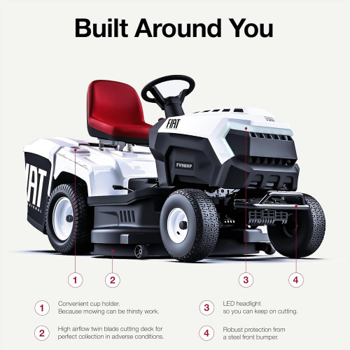 • Colector de césped de alta capacidad: un espacioso colector de 240 litros reduce los viajes de vaciado, haciendo que el cuidado del césped sea más eficiente.El cortacésped de jardín de gasolina Veloce FV98HP marca el comienzo de una nueva era de corte de césped, combinando ingeniería de vanguardia con el estilo inconfundible digno de la insignia Fiat Professional Construido para mayor durabilidad y rendimiento, cuenta con un potente motor de doble cilindro, un sistema de corte de doble hoja y una transmisión hidrostática infinitamente variable. Añade funcionalidad y estilo, su faro LED animado es tan práctico como visualmente llamativo.