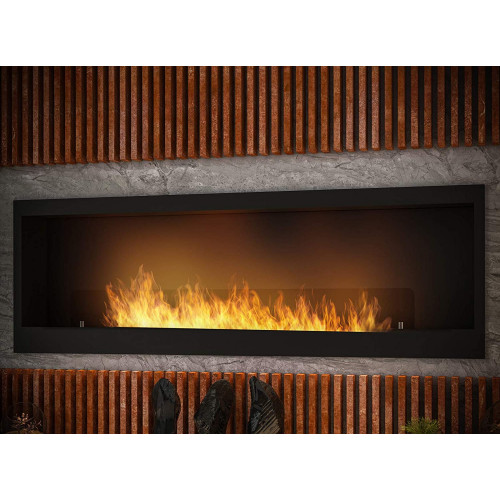 Chimenea de bioetanol empotrable en pared, color negro, modelo INSIDE 1500. Producto de diseño, muy buscado por sus líneas limpias y bien acabadas. Alimentación con bioetanol, un combustible líquido que no produce humos, malos olores y no necesita chimenea. No necesita electricidad. Es la chimenea con el quemador más grande. Dimensiones de la biochimenea: 1500 x 500 x 200 mm de profundidad. Quemador único de 100 cm con una capacidad de 3 litros. Potencia: 8 kW aprox. Autonomía de aproximadamente 3-4 horas. Material: Acero inoxidable de 1,5 mm con recubrimiento en polvo. Chimenea de bioetanol con marco de color negro mate. Cristal protector incluido para un diseño excepcional. Ideal para instalar en la pared, esta biochimenea es un producto de diseño fabricado en la UE. Más segura, gracias a la seguridad TÜV.