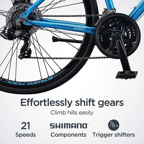 Vuela por la carretera con el Volare 1200 de Schwinn. El Volare 1200 cuenta con un marco de aluminio para fitness con una horquilla rígida que es perfecta para una conducción rápida y ágil. Los cambios de gatillo de 21 velocidades proporcionan cambios rápidos de marcha para que puedas adaptarte a tu terreno con facilidad. Y cuando necesites parar, los frenos de disco de aleación te dan una potencia de frenado superior. El sillín Schwinn Sport con tija de sillín de aleación proporciona un asiento ligero y cómodo, incluso en largos paseos. Al igual que todas las bicicletas Schwinn, la Volare 1200 viene con una garantía limitada de por vida mientras tengas la bicicleta. Obtén la velocidad y agilidad que has estado buscando con el Volare 1200. Disfruta de la libertad de montar un Schwinn.