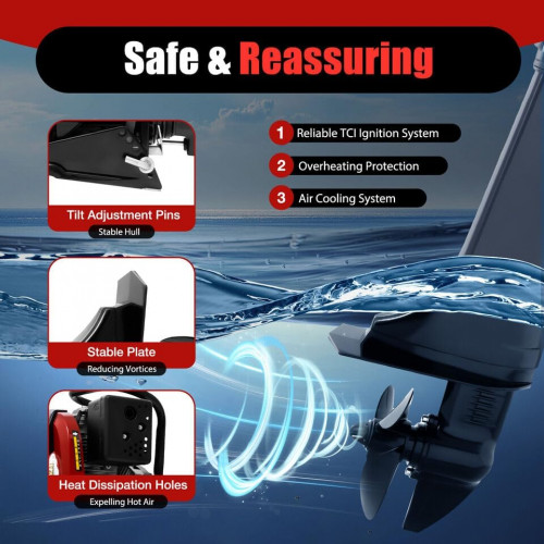 - SEGURIDAD Y TRANQUILIDAD: El confiable sistema de encendido TCI para un arranque rápido y seguro del motor, los pasadores de ajuste de inclinación suspendidos y las placas anti-vórtice reducen la inclinación y el vórtice para un funcionamiento suave. Los eficientes disipadores de calor y la protección contra sobrecalentamiento le permitirán disfrutar de su viaje.