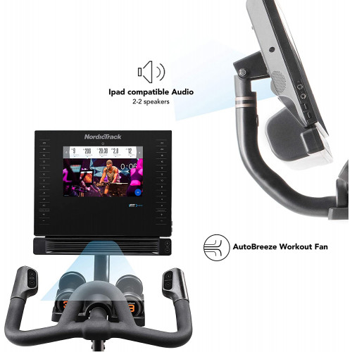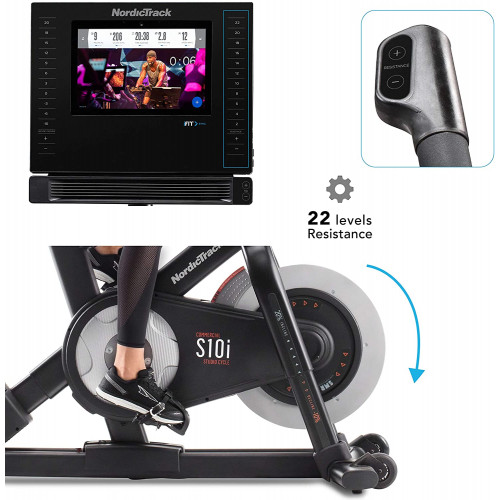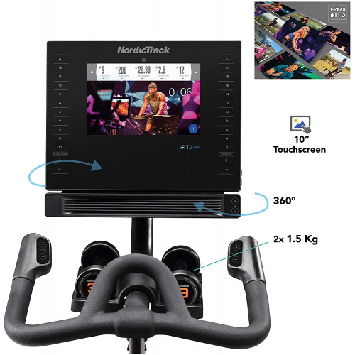 Características de la bicicleta estática Commercial S10i Studio Cycle de NordicTrack: con la bicicleta Commercial S10i de NordicTrack, ahora puedes disfrutar del cross training desde casa y con tu propio entrenador personal. Esta bicicleta de diseño innovador será tu aliado perfecto para lograr un entrenamiento con resultados óptimos. Touch Control de -10 a 20 %: con solo apretar un botón, la bicicleta ajusta al momento la declinación o inclinación de -10 a 20 %. Ventilador Autobreeze: el ventilador ajusta su potencia de forma automática en función de la velocidad de la bicicleta y también puedes seleccionar la intensidad en el panel de control. 1-Touch Resistance Control: con solo apretar un botón, la bicicleta Commercial S10i ajusta al momento la resistencia (24 niveles) para aumentar la dificultad y aportar variedad a los entrenamientos. La pantalla táctil HD en color de 10 pulgadas se puede girar e indica la velocidad, la inclinación, la distancia, las pulsaciones, el tiempo y las calorías. Portabotellas: tendrás la botella de agua a mano durante tus sesiones de cardio para mantener una hidratación adecuada. Sillín y manillar ajustables: el sillín de la bicicleta Commercial S10i Studio Cycle es ajustable y flexible; su manillar también es ajustable para garantizar la comodidad en tus sesiones de entrenamiento. iFit integrado: accede a numerosos programas de entrenamiento (vídeos de entrenamiento) y practica tus sesiones deportivas por todo el mundo o en gimnasio. La bicicleta sincroniza el desnivel y la resistencia en función del recorrido y las indicaciones de tu entrenador (suscripción de 1 año incluida). Ahora puedes personalizar tu propio programa de fitness, disfrutar de sesiones de entrenamiento automáticas y gestionar tu perfil en línea. Pulsaciones cardíacas con el sistema de electrocardiograma (contacto de las manos con los sensores) o mediante cinturón con bluetooth (no incluido), y pesas incluidas.