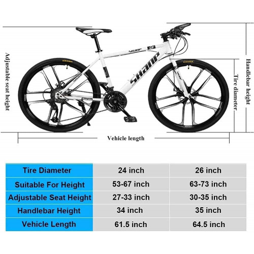 • 1. Bicicleta de montaña profesional, tamaño: 61.5x34 pulgadas, 21 velocidades, 24 velocidades, 27 velocidades, 30 velocidades, 4 tipos, cuadro de bicicleta hecho de acero con alto contenido de carbono, sistema de freno de doble disco