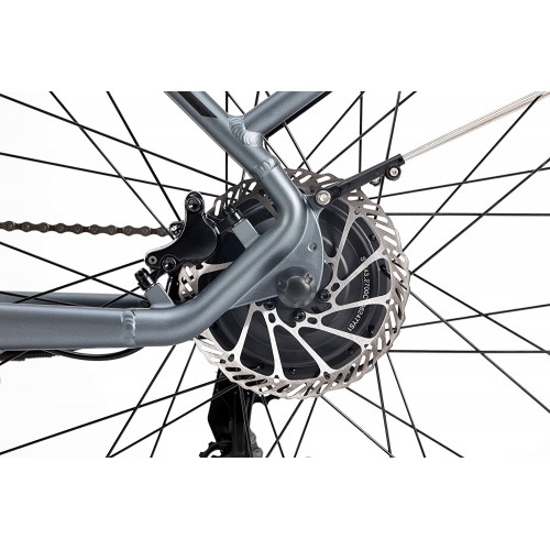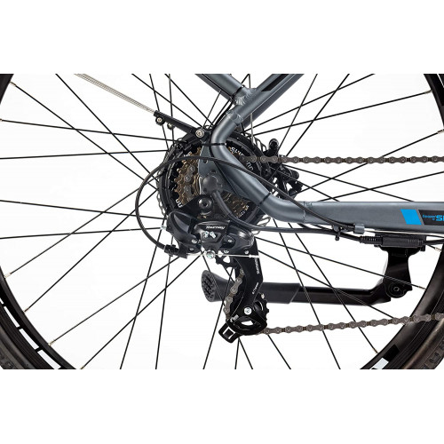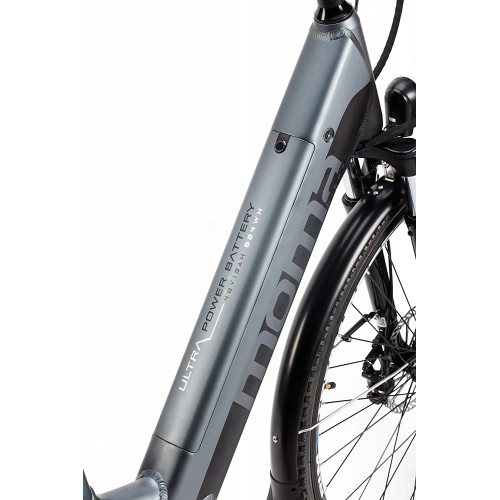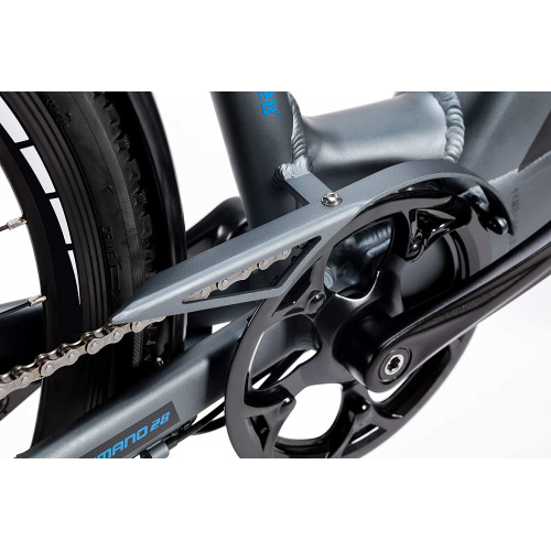Gracias a su motor de 250W con 55Nm de par con cuatro niveles de asistencia, podremos adaptarnos a cualquier situación en cualquier momento, y es capaz de alcanzar fácilmente la velocidad máxima regulada de 25 km/h. La pantalla de última generación, instalada en el manillar, nos informará en todo momento del nivel de asistencia solicitado, velocidad, distancia y nivel de la batería. Está equipada con cambio de 7 velocidades de la marca Shimano, ruedas de 28 pulgadas, suspensión delantera hidráulica Suntour NEX y frenos de disco hidráulicos. Cuenta además con todos los complementos de una bicicleta de paseo: luces, portaequipajes, guardabarros, caballete y timbre.