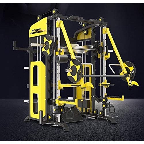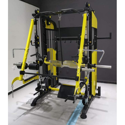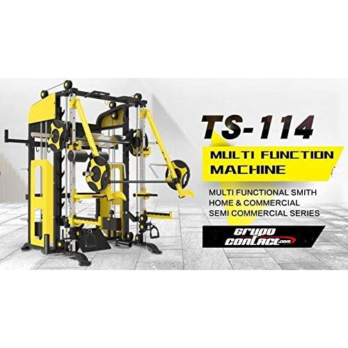 Maquina multifunción TS114 (dobles poleas- multipower) profesional. Maquina profesional, para un trabajo muy completo , para deportistas que quieran trabajar con intensidad y en espacio reducido. Hasta 90 ejercicios a realizar combinando diferentes grupos musculares, quizá la maquina mas completa del mercado. Dispone en la posición: 1º- 2 poleas laterales en cada columna, para poder trabajar con diferentes ángulos, estas poleas están alimentadas de peso por medio de dos columnas de placas. Peso de cada columna: 60 Kg. 2º- Dispone de un multipower, el cual se carga por medio de discos y también puede estar enganchada a las columnas de peso en placas. 3º-Dispone de barra dominadas para trabajo de dorsal con un agarre variable para un trabajo eficaz dependiendo de usuario. 4º-Dispone de brazos centrales para entrenamiento de pecho (press), con carga a discos. 5º-Incluido accesorios de fondos de pecho. 6º-Incluido un soporte para barra recta, para hacer levantamiento. 7º-Equipado con 6 soportes para discos. 8º-Dispone de plancha en barra de multipower para hacer prensa de piernas. 9º-Con doble torre de poleas regulable en altura. (no incluido discos). Medidas maquina: 1800 x 2190 x 2270 cm (alto) Medias embalaje: 2700 x 1730 x 45 mm. Peso en cada columna de placas: 60 Kg. Peso total de la maquina: 480 kg. La barra guiada (cromada) donde se colocan los accesorios mide: 50 x 50 mm. x 22 mm (el orificio de enganche). ESTAS MEDIDAS SON IMPORTANTES POR SI QUEREMOS COMPRAR OTROS ACCESORIOS, QUE NOS ENCAJEN SIN PROBLEMAS.