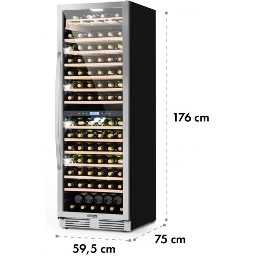 Klarstein Vinovilla Grande - Vinoteca, Nevera vinos, 425 L, 165 botellas, Control táctil, Temperatura ajustable, Soporte para copas, 13 estantes de madera, 2 zonas, Nevera para vinos, Plateado [Clase de eficiencia energética G]