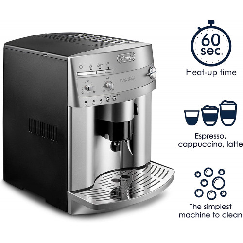 - Capaz de preparar espresso, café, capuchino, bebidas con leche y más, esta máquina súper automática cuenta con un sistema único de granos para preparar granos de café justo antes de preparar un espresso excepcionalmente aromático. El aparato viene equipado con dos calderas de acero inoxidable que proporcionan una excelente distribución del calor, así como una función de recalentamiento instantáneo, que mantiene la máquina a una temperatura ideal, sin importar cuánto tiempo sea el intervalo entre tazas. Además, su molinillo silencioso muele automáticamente los granos y se puede ajustar a un nivel de molienda específico, pero la unidad también se puede utilizar con café molido si lo prefiere. El panel frontal de la unidad ofrece controles de fácil acceso para el interruptor de encendido/apagado y el sistema de capuchino, así como para ajustar la cantidad de agua y café para adaptarse a gustos individuales, desde largo o corto a débil o fuerte. Su sistema patentado de capuchino gira 180 grados para permitir cualquier tamaño de recipiente de leche, además de la altura de la espiga de café se puede ajustar para adaptarse a todos los diferentes tamaños de taza, desde una taza clásica de espresso hasta una taza alta. Aún más, la exclusiva bandeja de tazas mantiene las tazas calientes antes de su uso, y su apagado automático de tres horas proporciona mayor seguridad. Otros aspectos destacados incluyen un tanque de agua extraíble de 60 onzas, un práctico indicador de nivel de agua, un recipiente de granos de 7 onzas, un termostato electrónico de vapor y café, programas de enjuague y descalcificación automáticos, y una bandeja de goteo extraíble para una fácil limpieza. Fabricado en Italia. Del fabricante Capaz de preparar espresso, café, capuchino, bebidas con leche y más, esta máquina súper automática cuenta con un sistema único de granos para preparar granos de café justo antes de preparar un espresso excepcionalmente aromático. La máquina hace espresso a una temperatura consistentemente ideal debido a su nueva caldera doble de acero inoxidable, que proporciona una excelente distribución del calor, así como su función de recalentamiento instantáneo, que mantiene la máquina a una temperatura ideal, sin importar cuánto tiempo sea el intervalo entre tazas. Su molinillo de rebabas integrado que ahorra espacio muele automáticamente los granos y se puede ajustar a un nivel de molienda específico, pero la unidad también se puede utilizar con café molido si lo prefiere. Su depósito de agua extraíble de 60 onzas y recipiente de granos de 7 onzas permiten llenar cómodamente el tanque de agua y vaciar café molido. El panel frontal de la unidad ofrece controles de fácil acceso para el interruptor de encendido/apagado y el sistema de capuchino, así como para ajustar la cantidad de agua y café para adaptarse a gustos individuales, desde largo o corto a débil o fuerte. El sistema patentado de capuchino de la máquina gira 180 grados para permitir cualquier tamaño de recipiente de leche, mientras que su altura de espiga de café se puede ajustar para permitir todos los tamaños de taza diferentes, desde una taza de espresso clásica hasta una taza alta. La unidad cuenta con una exclusiva bandeja para tazas para mantener las tazas calientes antes de su uso, así como un apagado automático de tres horas para mayor seguridad. Para mayor comodidad, la unidad viene con un indicador de nivel de agua, un termostato electrónico de vapor y café, programas automáticos de enjuague y descalcificación, y una bandeja de goteo extraíble para una fácil limpieza. Unidad de preparación: El "corazón" de Magnificent The Magnifica cuenta con el sistema de preparación extraíble más pequeño disponible en el mercado. Porque la caldera patentada DeLonghis es tan compacta. Y, gracias a la caldera extraíble, limpiar el interior de la máquina es fácil. Incluso las zonas normalmente difíciles de alcanzar se pueden limpiar fácilmente y sin el uso de detergentes agresivos. Y debido a que el mantenimiento regular ayuda a prolongar la vida útil de la máquina, la fiabilidad de DeLonghis es insuperable. Sistema de granos a preparación. Uno de los secretos para hacer un espresso de alta calidad es usar granos de café recién molidos. Debido al sistema de granos a preparar, el Magnifica te ofrece café que tiene un delicioso aroma. El café está recién molido y no deja rastros en la máquina. Magnifica es la única máquina súper automática que ofrece los resultados más frescos. Características compactas y de alto rendimiento: porque la nueva caldera patentada DeLonghis es tan compacta. Fiabilidad atemporal: gracias a la caldera doble extraíble de acero inoxidable, el interior se puede limpiar fácilmente. La limpieza regular de la máquina es esencial para mantener el mejor sabor posible y para minimizar la necesidad de servicio. Un aroma perfecto. No se dejan rastros de terrenos rancios en la máquina. Recalentamiento instantáneo: esta función especial calienta el núcleo de Magnifica, asegurando que la máquina esté siempre a la temperatura ideal para espresso, sin importar cuánto tiempo sea el intervalo entre tazas. Depósito de agua extraíble y contenedor de frijoles: Magnifica sabe que el espacio en la encimera de tu cocina siempre es premium. Magnifica es la única máquina súper automática que te permite llenar el tanque de agua y vaciar los granos de café sin mover la máquina. Todos los controles están en la parte delantera de la máquina, desde el interruptor de encendido/apagado hasta el sistema de capuchino. Molinillo de rebabas integrado: un recipiente que ahorra espacio para granos está totalmente integrado en el Magnifica. Puedes establecer el nivel de molienda para personalizar tu espresso. Magnifica también se puede utilizar con café molido. DeLonghi recomienda el uso de illycaffe para el mejor sabor de espresso. Rico, s