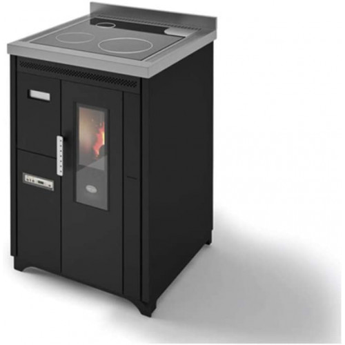 Esta cocina económica de pellets ventilada, dispone de un sistema frontal de carga de pellets muy fácil de usar que la hace realmente práctica en el uso diario. Su amplia placa superior, disponible en acero o vitrocerámica, es perfecta para cocinar los alimentos aprovechando el calor desprigionado. El escape de humos es superior o posterior. En el período de invierno, la ventilación forzada permite calentar de forma rápida y uniforme todo el entorno, mientras que en el verano se puede cocinar excluyendo la ventilación forzada. Diseñado para ser funcional, incluso el diseño no ha sido descuidadoso, ya que el amplio panel de vidrio hace que el fuego sea a la vista. Placa de metal con certificado para cocinar. Frontal puerta de cristal serigrafiado negro Ventilación forzada con posibilidad de excluirla del verano. Cajón frontal extraíble para la carga de pellets 10 (5+5) potencias de funcionamiento Pantalla con menú en 6 idiomas. Cajón ceniza extraíble para recuperación de cenizas Salida de humos superior - trasera. Termostato de seguridad. Preparado para termostato externo. Presostato de seguridad Cronotermostato Datos técnicos: Potencia quemada: máx. 7,5 kW ? Mínimo 2,8 kW Potencia de calentamiento máxima: 6,7 kW ? Mínimo 2,5 kW Eficiencia energética A+. Rendimiento: Pmax 88,5% ? Pmin 89,1% Valor de CO con 13% de O2 (%): Pmax 0,019% - Pmin 0,011% Consumo horario pellet: máx. 1,6 kg/h - mín. 0,6 kg/h. Capacidad del depósito: 16 kg. Tamaño de la zona calefactable: 70 ? 160 mc Distancia mínima de la pared inflamable: lado: 20 cm, parte trasera: 1 cm, parte delantera: 100 cm. Tensión de alimentación / Freq. : 230V ? 50 Hz Potencia nominal eléctrica: 320 W. Medidas: L 59,8 x P 61,8 x H 91,6 cm Peso: 133 kg. Cámara de combustión de acero Brasero de acero inoxidable. Cumple con la normativa EN14785 - BImSchV
