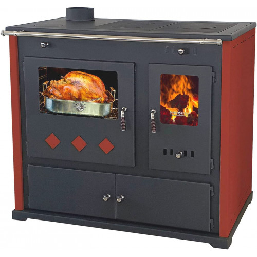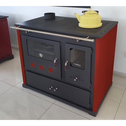 Prometey, Estufa de leña con compartimento y placa de cocción Pracktik Lux, color rojo izquierdo, 9,5 kW, estufa de combustión continua, estufa de taller, estufa sueca, estufa de cabaña [Clase de eficiencia energética A+]