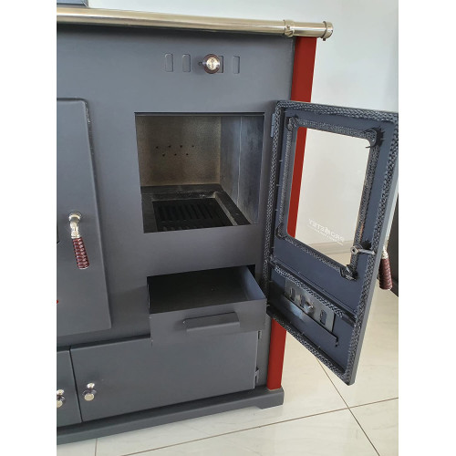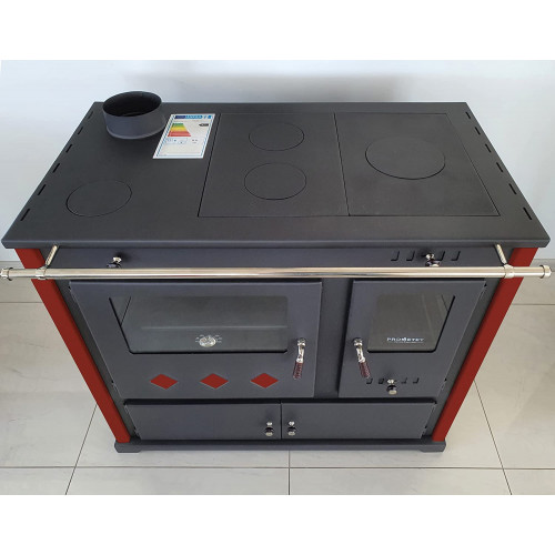 • Con esta estufa de leña calentarás en tu casa correctamente. Gracias a su aspecto elegante y moderno, esta estufa se integra perfectamente en cualquier habitación. Prepara tu comida favorita en el horno extra previsto para ello o haz un pan. También puedes utilizar una de las cuatro placas de cocción en la parte superior del horno para cocinar. Cocina y hornea sin el uso de electricidad o gas. Para controlar la temperatura del horno hay un termómetro en el cristal. Almacena tu leña cómodamente bajo el horno. Cámara de combustión forrada con piedra refractaria. Ventana integrada. Bandeja para cenizas extraíble. Entrada de aire ajustable interior y exterior. Adecuado para quemaduras de tiempo y duración. Dimensiones: 94 x 90 x 52 cm. Dimensiones de la cámara de combustión: 40 x 26 x 42 cm. Dimensiones del compartimento para hornear: 23 x 43 x 47 cm. Diámetro del tubo de salida de humo: 130 mm de diámetro, diámetro exterior de suministro de aire de 80 mm (suministro de aire externo). Peso: 106 kg. Color: rojo. Distancia mínima a materiales inflamables desde el lado: 30 cm. Distancia mínima a materiales inflamables desde la parte delantera: 95 cm. Distancia mínima de materiales inflamables desde la parte trasera: 40 cm. Potencia calorífica de 9.5 kW. Eficiencia: 87.54%. Valores de emisión: NOx (95.5 mg/m). OGC (68.8 mg/m). Contenido del polvo ardiendo (29.8 mg/m). Eficiencia energética: A+. Combustibles adecuados: leña, briquetas de madera. Cumple con la nueva norma de BImSchV nivel II. Tipo