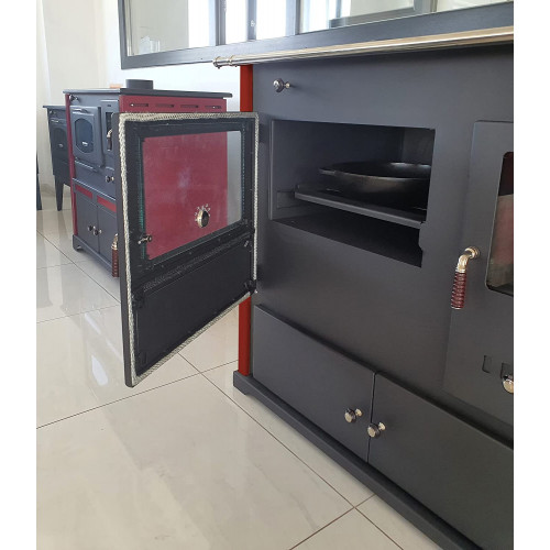 • Con esta estufa de leña podrás calentar tu casa correctamente. Gracias a su aspecto elegante y moderno, esta estufa se adapta perfectamente a cualquier habitación. Prepara tu comida favorita en la cámara de cocción extra prevista para ello o haz un pan. También puedes utilizar una de las cuatro placas de cocción en la parte superior del horno para cocinar.