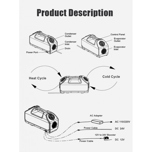 Enfriador de aire portátil, 3 velocidades de ventilador, pantalla LED táctil inteligente Aire acondicionado portátil de alta potencia Nuestro aire acondicionado portátil admite una entrada de voltaje de 24 V. Si el voltaje de la batería es de 48 V u otro voltaje, se requiere un transformador o inversor adicional para el uso normal de este acondicionador de aire.