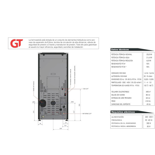 • Eficiencia térmica: Esta termoestufa está equipada con elementos hidráulicos de alta eficiencia, como vaso de expansión, bomba de circulación y válvula de seguridad de 3 bares para garantizar un rendimiento óptimo.