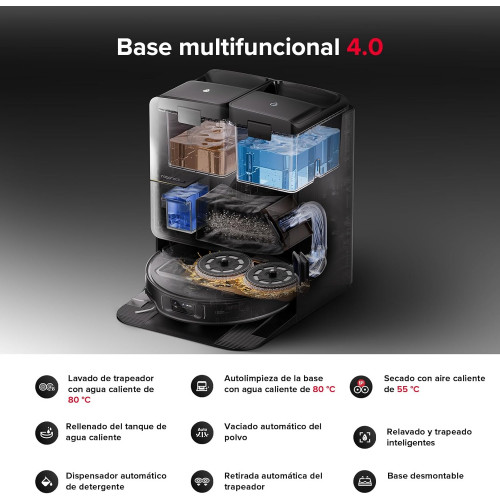 - Base Multifuncional 4.0 - Mantenimiento 10 en 1 sin contacto: Con agua caliente a 80 °C, el robot aspirador Saros Z70 retira automático, lava la mopa y limpia la base, y luego, seca con aire tibio a 55 °C. También puede relavar y trapear inteligentes. Con este base multifuncional 4.0, es muy sencillo de Mantener limpia sin intervención. Además de las características de mantenimiento autónomo de la base de Saros Z70, la nueva variante cuenta con funciones de llenado y vaciado, para una experiencia de limpieza automática sin precedentes.