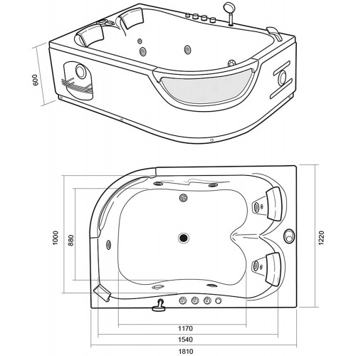 - ESPECIFICACIONES TECNICAS Medidas de la bañera: base 180 x 120 Cm alto 60 cm Bomba Whirlpool 1,5HP Sistema de control de las toberas de aire Sistema de desinfección y esterilización 2 Apoyacabezas 7 toberas grandes cromadas 2 toberas pequeñas Sistema de protección contra la dispersión de electricidad (cortacircuitos automático) Tablero de control (computadora) Radio 1 Ducha multifunción