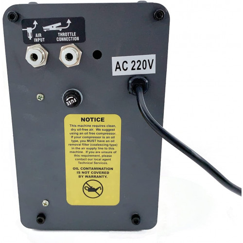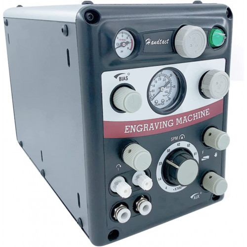 - La máquina grabadora tiene conexiones para dos piezas de mano de impacto y una conexión auxiliar auxiliar para otras herramientas de aire, incluida la pieza de mano giratoria. Dos piezas de mano y un control de un pie vienen con la máquina grabadora como foto. Filtros tal vez diferentes