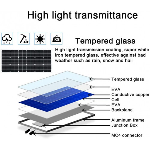 • 5 paneles solares: paneles solares monocristalinos de 100w, la eficiencia de conversión puede alcanzar el 22,9%, incluso en entornos con poca luz también tiene un excelente rendimiento. El vidrio en el está hecho de alta dureza, alta transmisión de luz, resistencia a altas temperaturas, capa de vidrio solar de vidrio completamente templado.