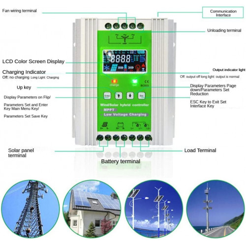 Controlador de carga híbrido eólico-solar, Coincidencia automática de 12/24/48 V Energía eólica de 0-300 W, sistema solar de 0-500 W.