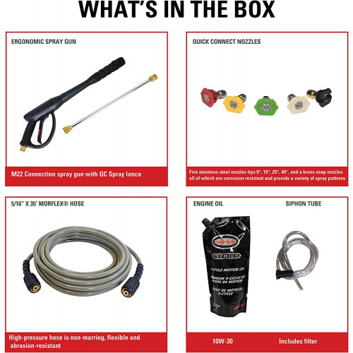 • Todas las lavadoras a presión son 100% funcionalmente probadas en fábrica y pueden contener un mínimo de combustible residual/aceite o olor a combustible. Conexión de pistola/manguera: conexión roscada M22