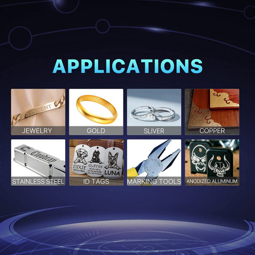 • Marcado en materiales metálicos y no metálicos. Marcado en varios metales como aluminio, acero inoxidable, latón, cobre, etc. También algunos de los no metales como nailon, botón de luz, ABS, PVC, PES, etc.
