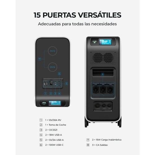 • [15 Puertos Versátiles] - Un puerto RV de 12V/30A para vehículos móviles, cargador inalámbrico de 15W y puertos más versátiles como 3000W AC/100W USB-C/36W USB-A/DC 5521.