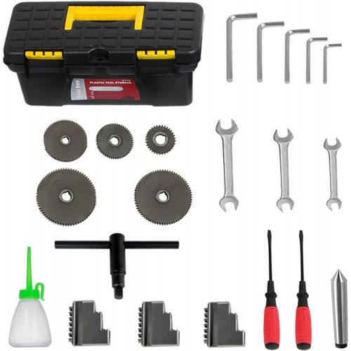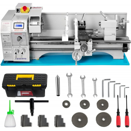 Especificaciones Giro sobre la cama: 8,7"/220 mm Deslizamiento transversal oscilante: 23,6"/600 mm Diámetro del mandril de 3 mordazas: 4,9"/125 mm Agujero a través del husillo: 1,5"/38 mm Velocidad variable (rpm): 50-3000±10% Gama de hilos imperiales: 8~44 TPI Rango de alimentación longitudinal: 0,5-3 mm Contenido del paquete 1 torno de metal. 1 soporte para herramientas. 1 x centro muerto MT2 1 pistola de aceite. 3 x mandíbula 5 engranajes. Algunos accesorios relacionados Diseño de velocidad variable Potencia del motor sin escobillas: 1,1 KW, velocidad variable (rpm): 50-3000±10 %. Cono en la nariz del husillo: MT5. Gran rango de giro Giro sobre bancada: 8,7"/220 mm, giro sobre carro transversal: 23,6"/600 mm, diámetro del portabrocas de 3 mordazas: 4,9"/125 mm. Descanso de herramientas de 4 vías Ofrece posiciones de corte interior, corte frontal y corte en bisel. El tornillo de plomo endurecido por calor es reversible girando la manija A y B Protección de apoyo Luneta y luneta para piezas de gran tamaño Dos protectores contra salpicaduras Contrapunto preciso Conicidad en husill