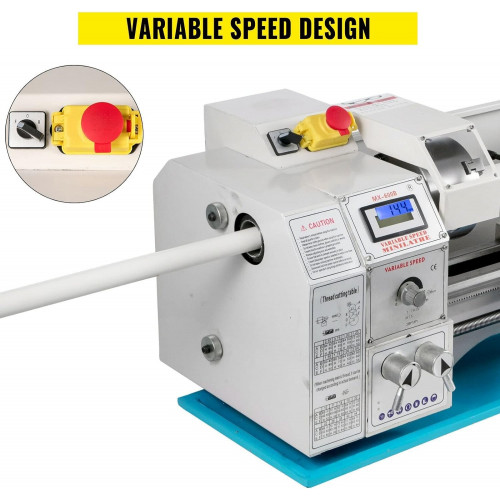 VELOCIDAD INFINITAMENTE VARIABLE El mini torno de metal es impulsado por un motor sin escobillas con potencia 11KW. Velocidad variable (rpm): 50-3000±10%. Cono en la nariz del husillo: MT5. La pantalla LED le muestra la velocidad clara y precisa para un trabajo preciso. Arranque suave, interruptor de cambio para rotación del husillo en el sentido de las agujas del reloj o en el sentido contrario. Opere manualmente o con la tasa de alimentación automática ajustable.