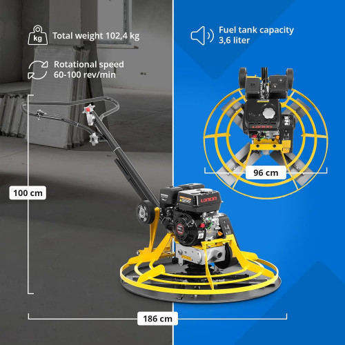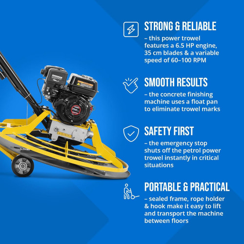 • Potente y fiable – esta allanadora de concreto cuenta con un motor de 6.5 HP, palas de 35 cm y velocidad ajustable de 60–100 rpm