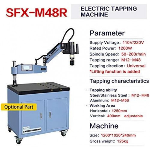 - Introducción: Las máquinas de roscar eléctricas pueden mejorar enormemente la productividad en la fabricación de piezas con una gran cantidad de orificios roscados. Adecuado for roscado M12-M48. Tensión de alimentación: 220V. Potencia nominal: 1200W. Velocidad: 50-200r/min. Radio de trabajo: 1180 mm. Tamaño: 47,2*40,2*9,45 pulgadas. Peso: 275,6 libras.