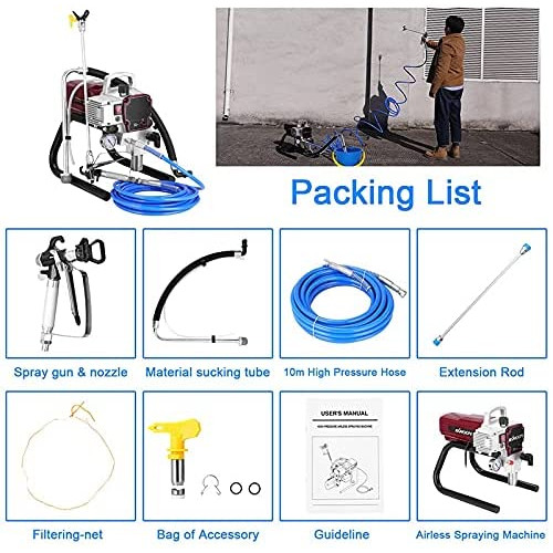 • Tiene las ventajas de la atomización fina, la operación sin humo y tiene una superficie de pulverización sin problemas y sin burbujas. Equipado con manómetro, el rango de medición es 0-40MPA / 0-6000PSI. Interruptor cubierto por caucho suave, conmutando rendimiento en situaciones de operación complejas. Una válvula de ajuste de presión para controlar la presión interna de la máquina.