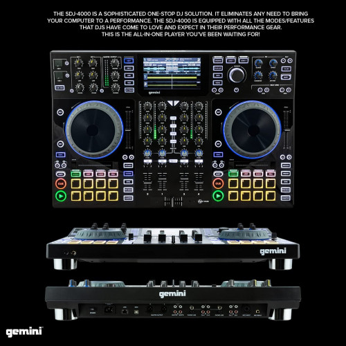 Gemini Sound SDJ-4000 DJ Equipment Console Table con 2 cubiertas, mezclador de audio de 4 canales, ruedas táctiles compatibles y pantalla HD de 7 pulgadas