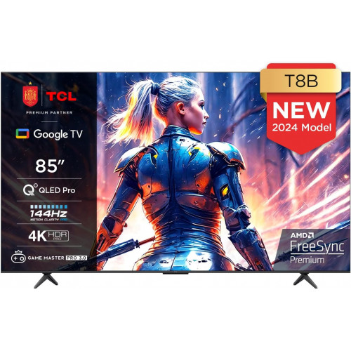 TCL 85T8B Gaming TV Onkyo QLED Pro de 85" y 144 Hz, 4K Ultra HD, HDR Pro, Smart TV Powered by Google TV (Dolby Vision IQ y Atmos, Motion Clarity, Control de Voz Manos Libres) [Clase de eficiencia energética F]