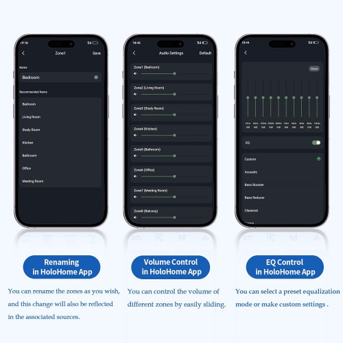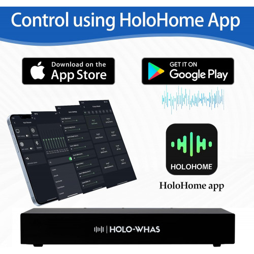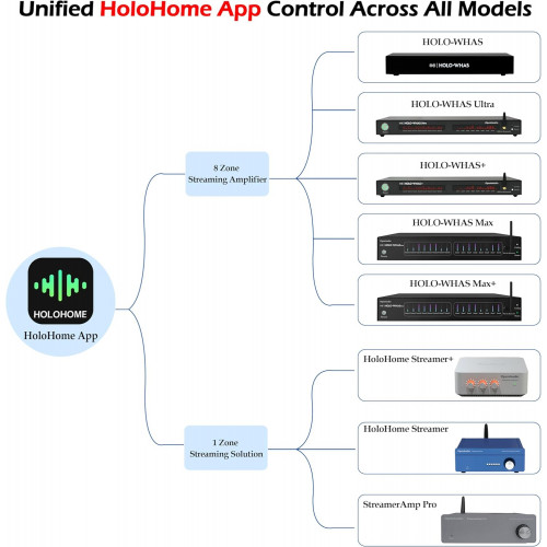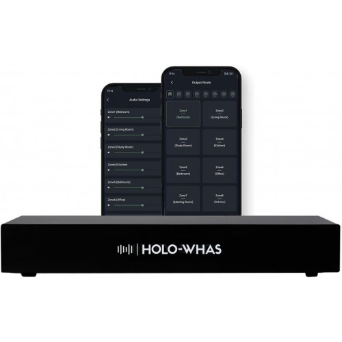 • Fácil configuración de red: proporciona una experiencia mejorada fuera de la caja (OBE), lo que permite a los usuarios configurar fácilmente la red HOLO-WHAS a través de una aplicación móvil sin necesidad de un punto de acceso WiFi. - La configuración está guiada, por lo que es simple y fácil de usar. Soporte multizona: soporta hasta 8 zonas de audio independientes simultáneamente. Permite reproducir diferentes contenidos de audio en diferentes salas o áreas, adecuado para hogares, espacios comerciales o salas de conferencias.