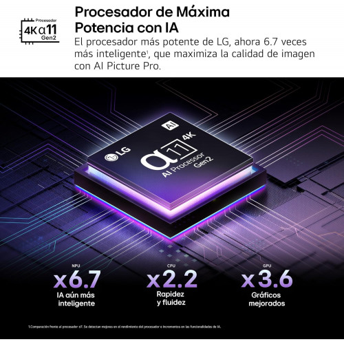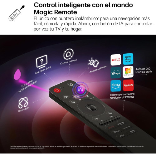 • Smart TV webOS 25 que evoluciona a mejor cada año renovándose en tu TV e incorporando las nuevas funciones de la IA y que está preparado para próximos apagones TDT. Más inteligente para una personalización y un control del hogar avanzados: reconocimiento de voz, recomendación de contenidos, configuración de imagen y sonido, asistente virtual y mando Magic Remote con puntero inalámbrico.