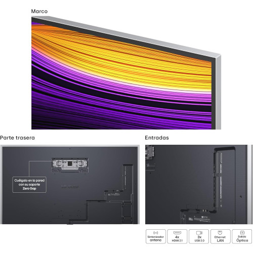 • Diseño Gallery ultrafino para una integración perfecta del TV en la pared gracias a su soporte exclusivo "Zero Gap" con instalación incluida.