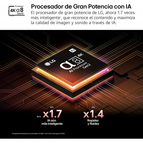 - El procesador de alta potencia, ahora 1.7 veces más inteligente (4K α8 Gen2), preparado para incorporar las novedades de la IA. Maximiza la calidad de imagen y sonido, trabajando en los 33 millones de puntos de luz independientes a través de la Inteligencia Artificial.