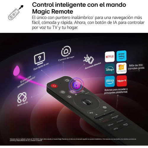 - Smart TV webOS 25 que evoluciona a mejor cada año renovándose en tu TV e incorporando las nuevas funciones de la IA y que está preparado para próximos apagones TDT. Más inteligente para una personalización y un control del hogar avanzados: reconocimiento de voz, recomendación de contenidos, configuración de imagen y sonido, asistente virtual y mando Magic Remote con puntero inalámbrico.